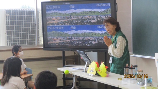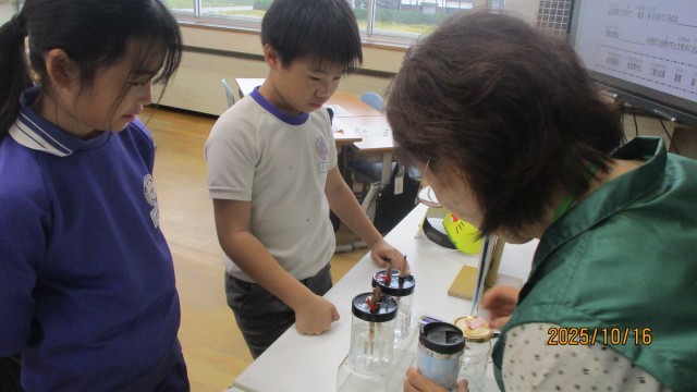 4年生の総合的な学習の時間では、自然環境について学習しています。今日は、外部講師の先生をお招きして、地球温暖化にならないための取組について考えました。食品ロスを減らすことや、節電・節水をすることが大切であることに気付きました。最後に、環境によい発電方法を実際に体験しました。