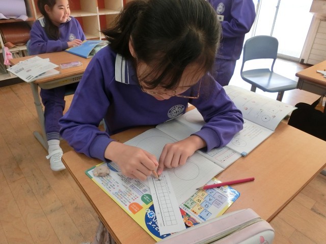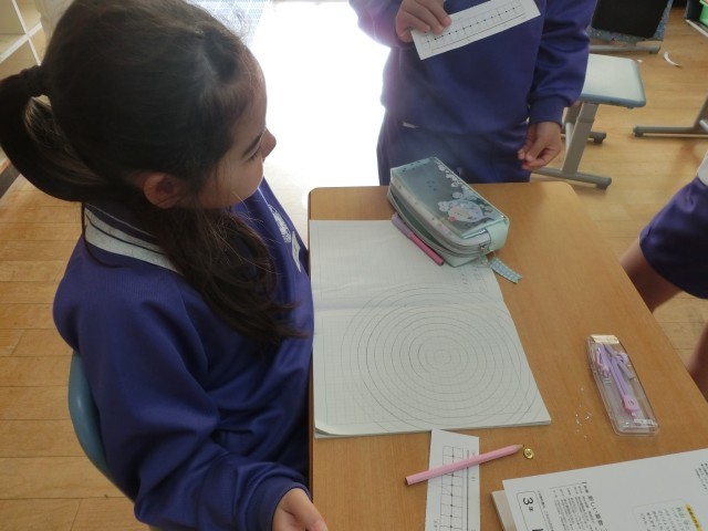 算数では、穴の開いた紙を使って、円を描くことに挑戦しました。始めは上手く描くことができなかった子供たちも、友達に手伝ってもらったり、アドバイスをもらったりして、色々な大きさの円を描いていました。