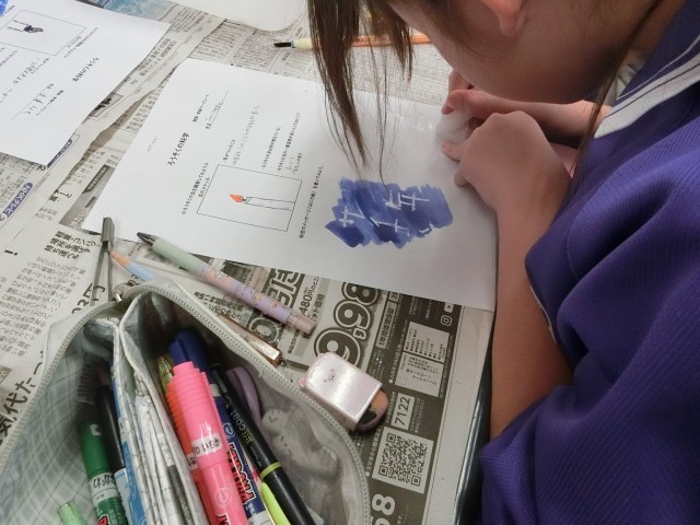 5年生のテーマは「ろうそくの科学」でした。まずオリジナルのろうそくを作りました。色やにおいを付けながらすてきなオリジナルろうそくを作ることができました。そこから、ろうそくの炎の仕組みや物が燃えているときの様子について学習しました。最後に、火のついたろうそくを水にうかべ、ビーカーをかぶせると火とビーカーの中の水はどうなるか予想しました。みんな火はしばらくしてから消えると予想しており、予想通りでした。水の量は、ほとんどの子が「変わらない」と予想していました。しかし、実際にビーカーの中の水の量がどんどん上がって、ろうそくが持ち上げられている様子を見てとても驚いていました。
