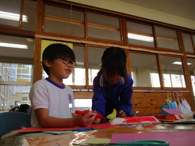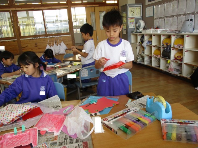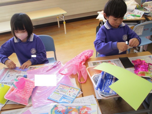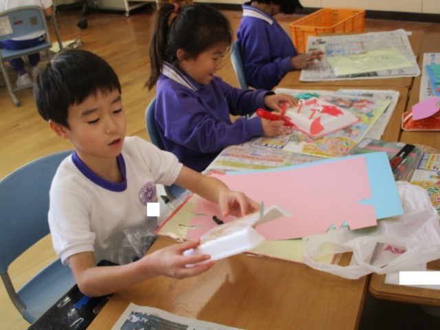 風が通るように切り込みを入れて、マジックや画用紙で飾り付けをしました。