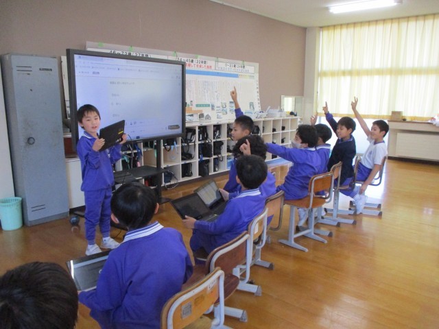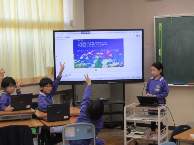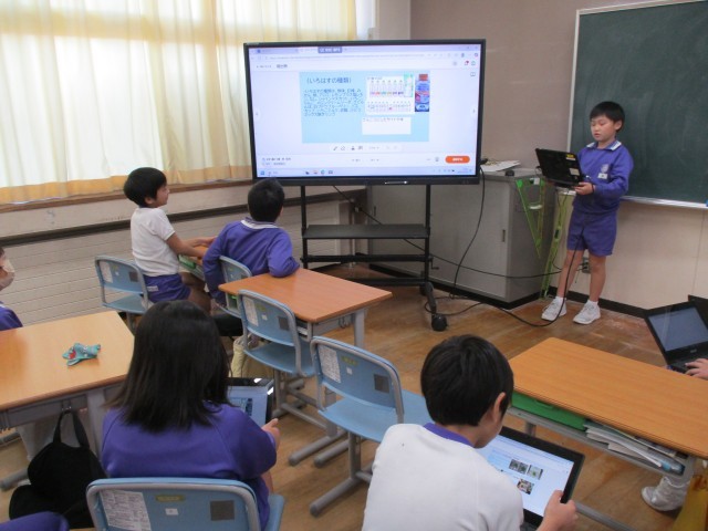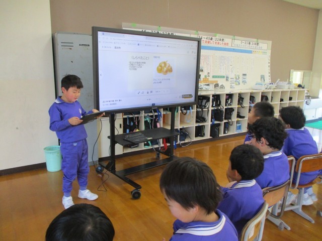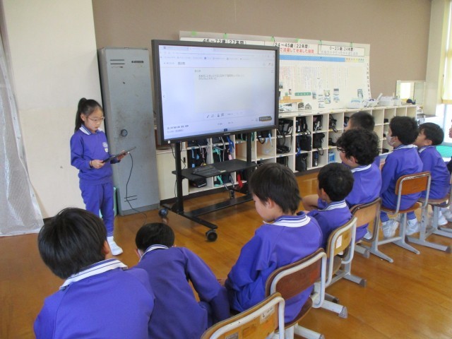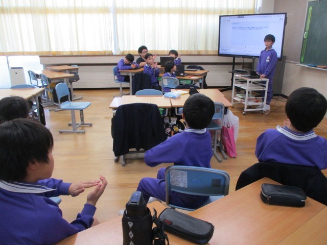2学期の総合的な学習では「となみのじまん」について学習しました。砺波市のすてきな所を見付け、その中から「ゆず」「大門そうめん」といった特産品や夜高祭り等について、自分でテーマを決めてくわしく調べてきました。今日は、調べたことの中から魅力や工夫について4年生に紹介しました。途中にクイズ等もあり、みんな大変興味をもって聞いてました。4年生からは、「初めて知った」「自分でも調べてみたい」といった感想も聞かれ再発見ができたようです。これからも砺波市のすてきな所について発信していきたいです。