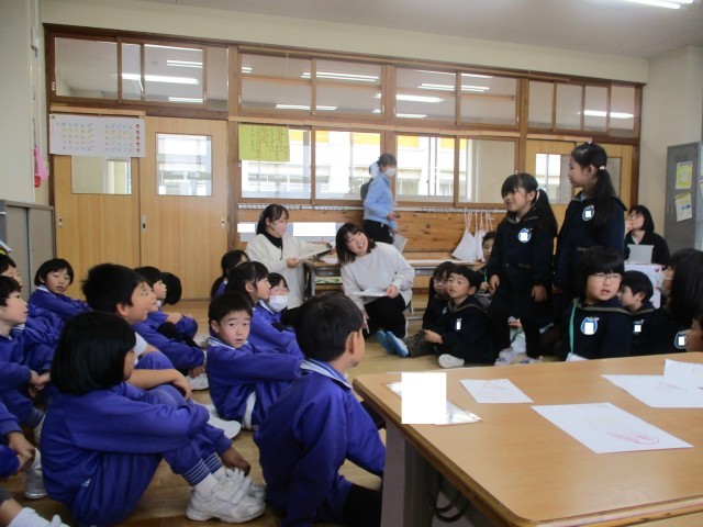 年長さんから「好きな勉強はなんですか?」「どんな遊びがありますか?」「おいしい給食は何ですか?」等の質問があり、それにこたえました。