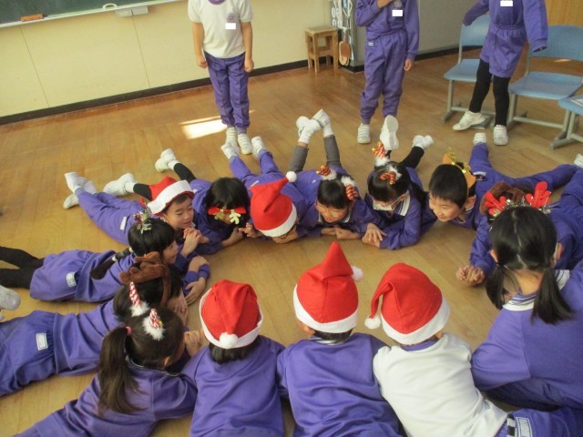 「だいこんぬきゲーム」では、みんなが大きな輪になって手をつなぎました。最後は力を合わせて引っ張ると、全員抜くことができました。