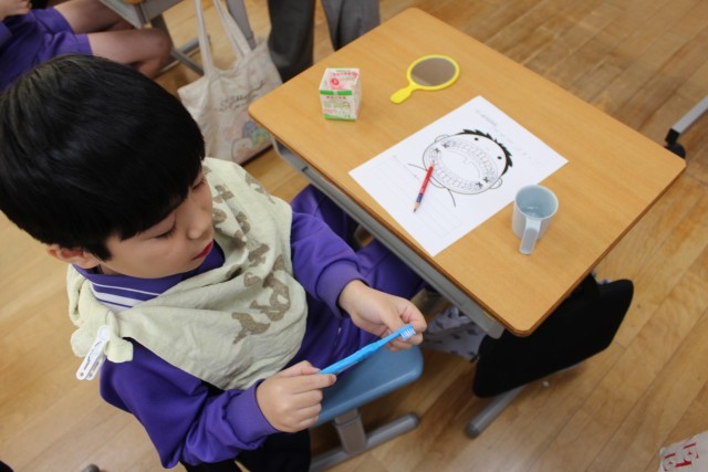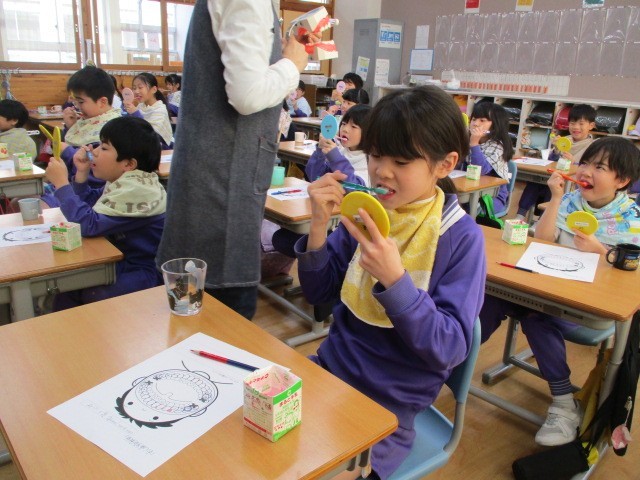 虫歯予防教室では、虫歯のことや正しい歯の磨き方について教えてもらいました。今日は、歯を染め出して虫歯菌のもとになる歯垢がどれだけ歯についているのかを自分で確かめました。手鏡で自分の口の中を見ながら前歯~奥歯を弱い力で小刻みに動かすことを意識しながら歯ブラシで丁寧に磨きました。虫歯予防教室の後の振り返りでは、「思ったよりも磨き残しが多かったので、歯磨きの時に気を付けたい」「虫歯にならないようにするために、甘いものを食べる量をお家の人と決めたい」等、学んだことをこれからの生活や歯磨きでも意識したいという気持ちが伝わってきました。