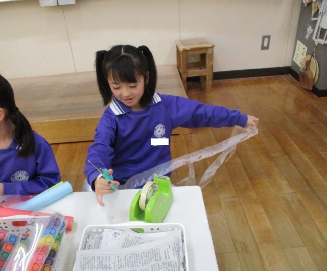 魔法使いや虫など、自分の変身したいものを決め、変身グッズを作っています。