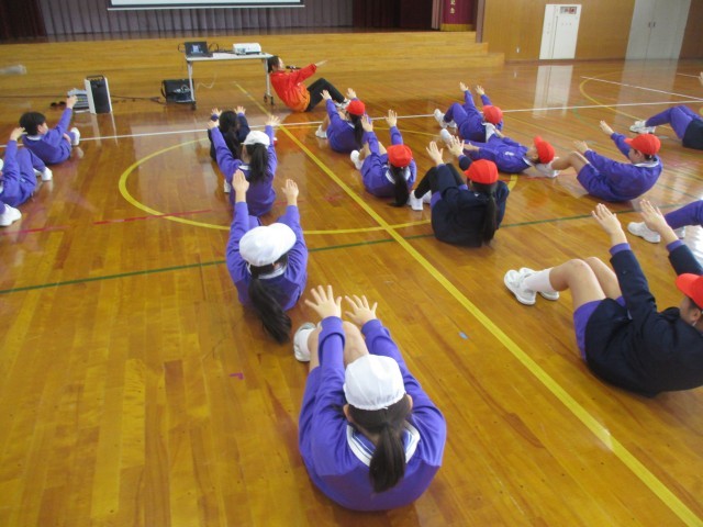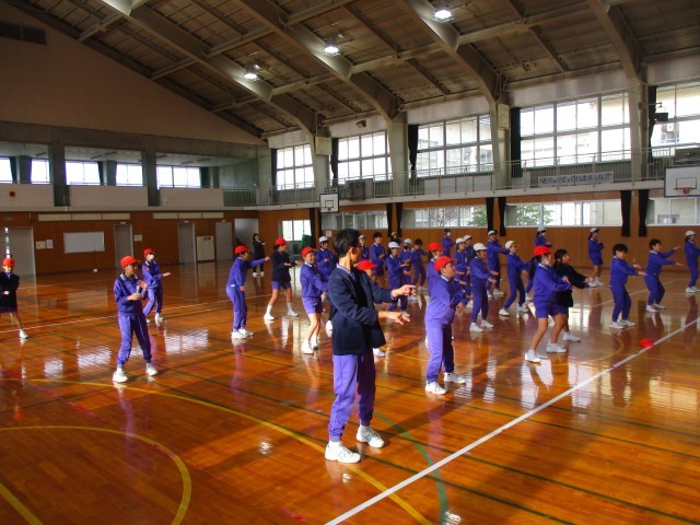 今日の体育指導では、リズムダンスを練習しました。「APT.」の曲に合わせて、腰を大きく動かしたり、手を回したりして踊りました。子供たちはノリノリになって、「この手の動きが難しいね」「手と足のリズムを意識しよう」と友達と関わりながら楽しんで踊っていました。