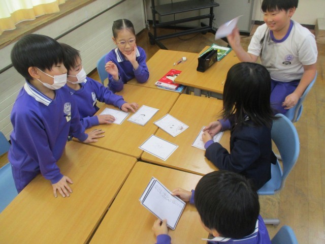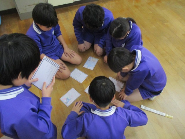 3年生は漢字の音読みや訓読みを使って、「音訓カルタ」をつくりました。教科書や辞典で言葉や漢字を調べながら作ったカルタを友達と読み合って、カルタを楽しみました。「音読みと訓読みで考えるのは難しいな」「楽しいと音楽という言葉をカルタに使いたいな」と深く考えながら作っていました。