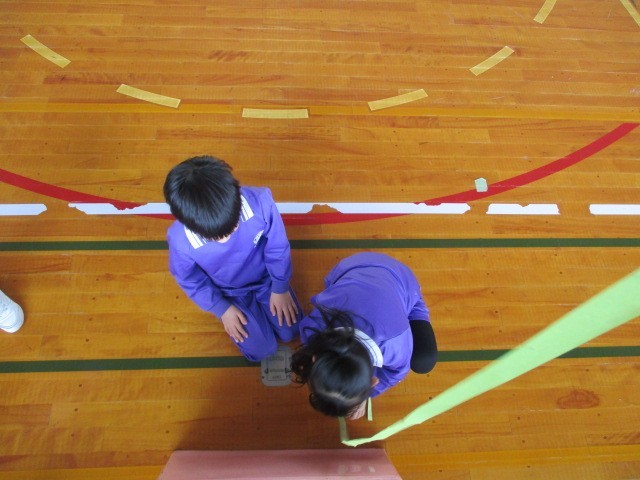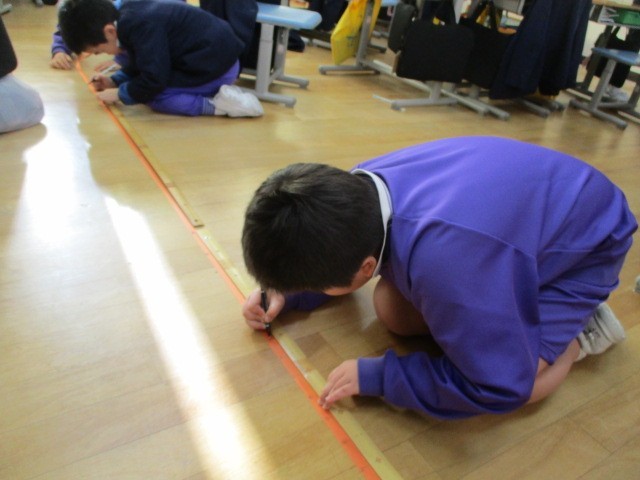 算数では、長さの学習をしています。今日は紙ものさしをグループで作り、黒板の横の長さや床からバスケットゴールのリングまでの長さ等を予想しながら、友達と協力して測りました。長さの単位であるcmやmを正しく使いながら長さを表すことができました。