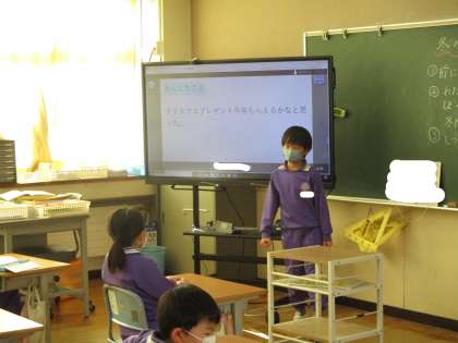 「窓が雪だらけになっていたこと」「きれいなクリスマスツリーが飾られていたこと」「冬の野菜、大根が成長していたこと」などと発表し、聞いている子供たちからはたくさんの質問や感想がありました。