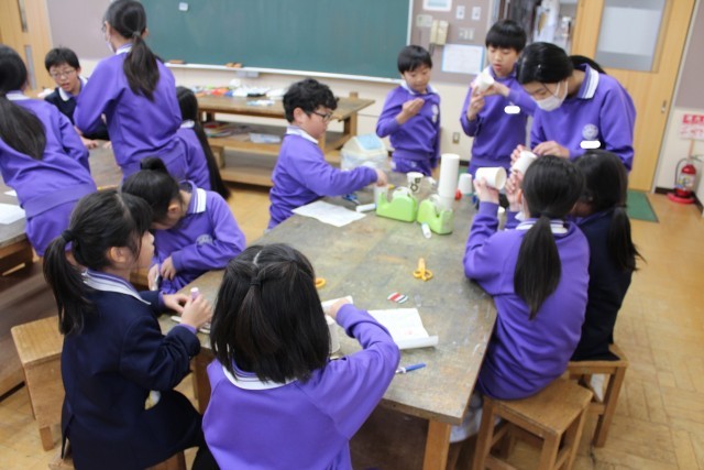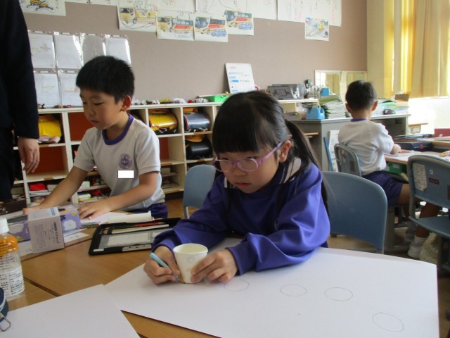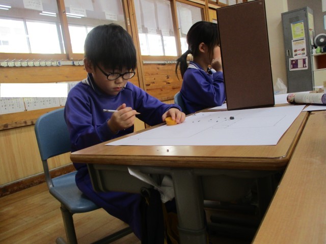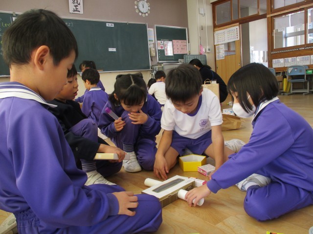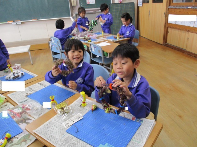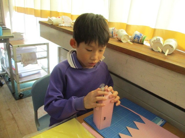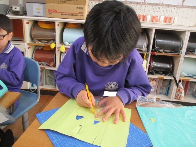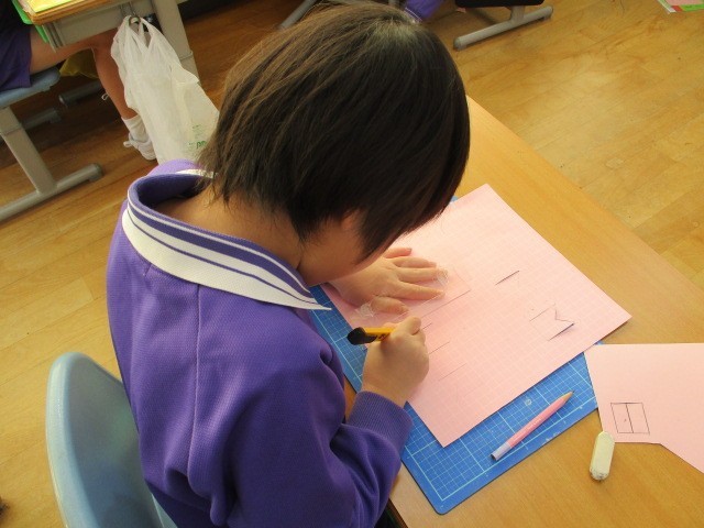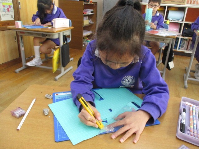 図工の学習では、カッターを使って色々な形に切ったり、窓を作ったりしています。丸い形の窓、三角の窓、両開きの窓など、どれもおもしろい形です。初めはカッターが怖いと言っていた子供たちも、カッターを使うことに慣れ、まっすぐに切ったり、くねくねに切ったりできるようになってきました。カッターの使い方も上達してきています。完成が楽しみです。