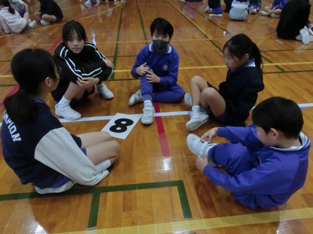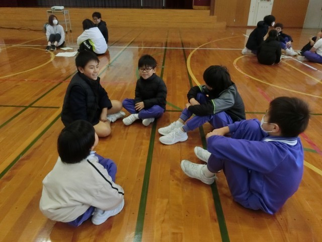 次に、いろんな学年の友達がいるグループで、テーマについて意見交換しました。下級生の話を、相づちを打ちながら聞く上級生の姿が素敵でした。