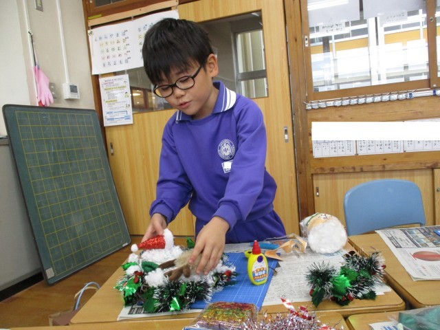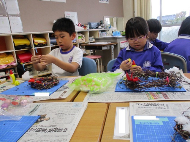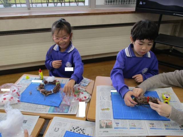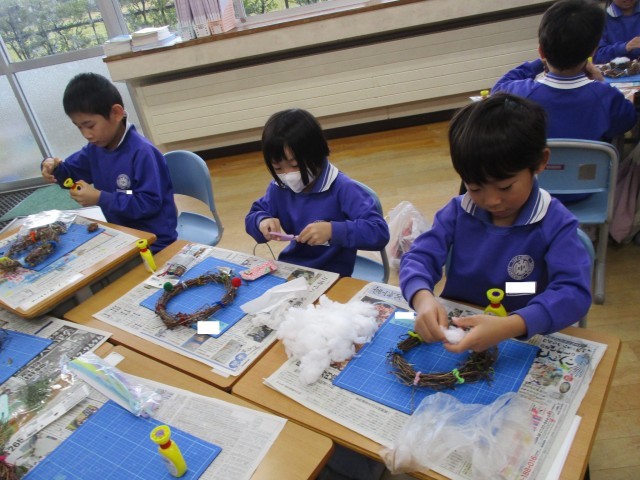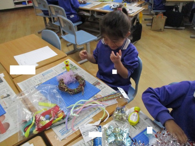 お家から持って来た飾りで飾り付けをして、かわいいリースが完成しました。