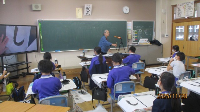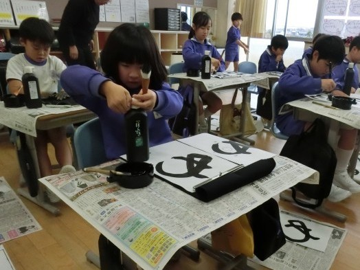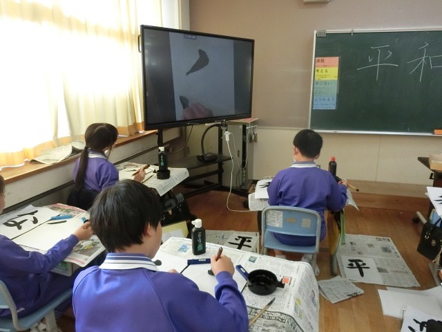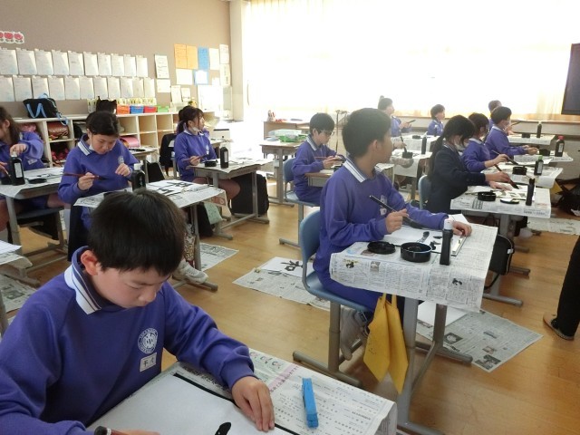 講師の先生を招いて、書初め練習を行いました。今年の五年生は「平和な海」です。