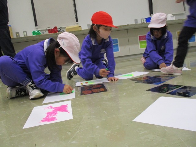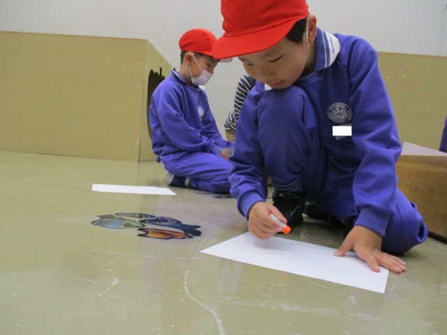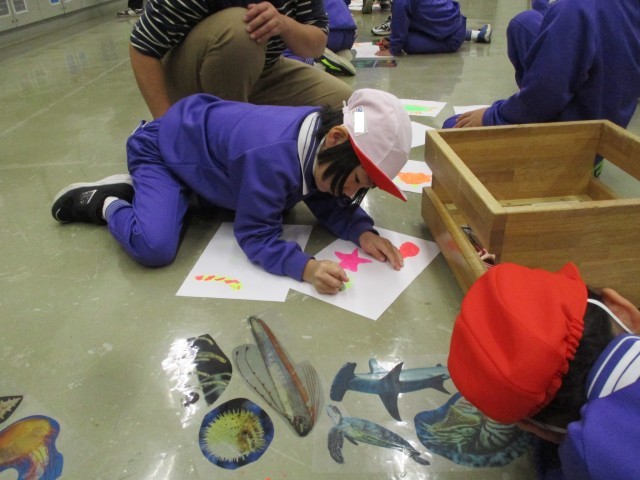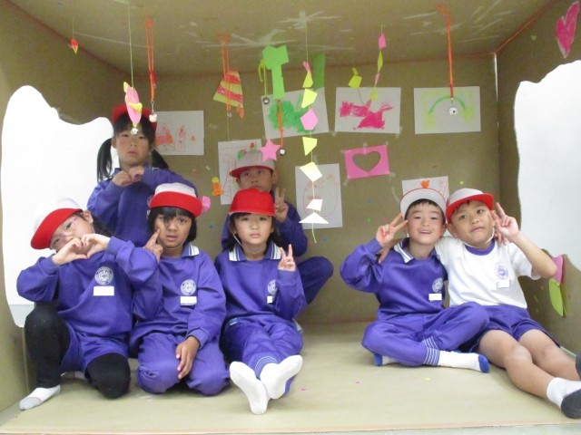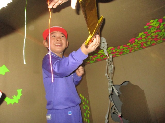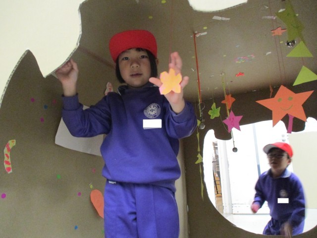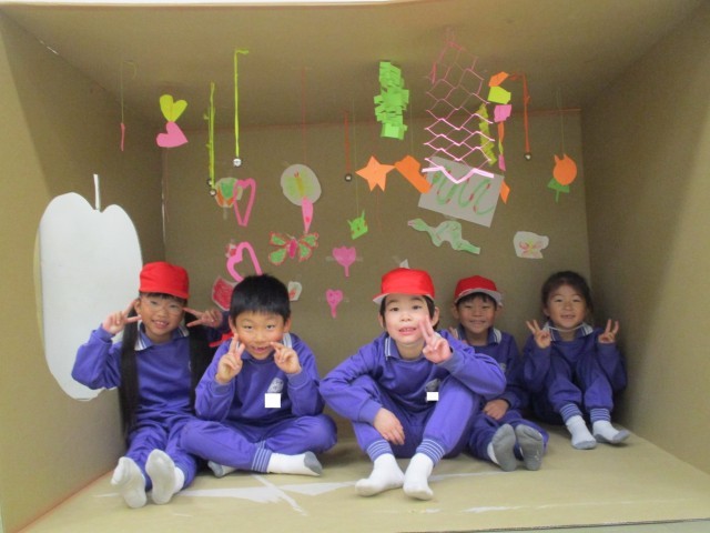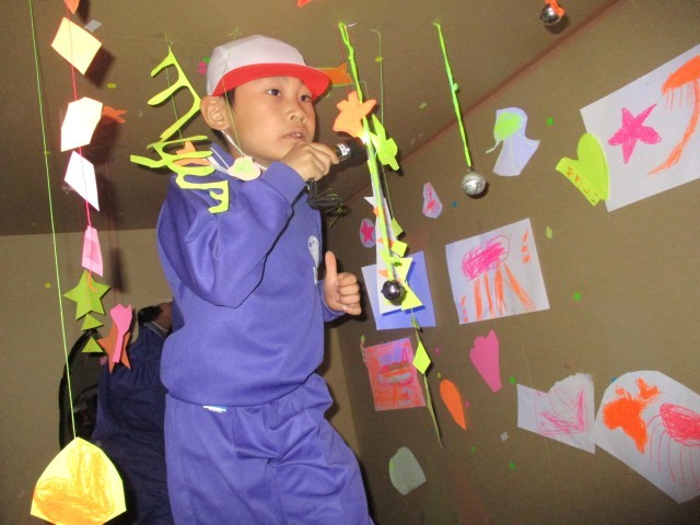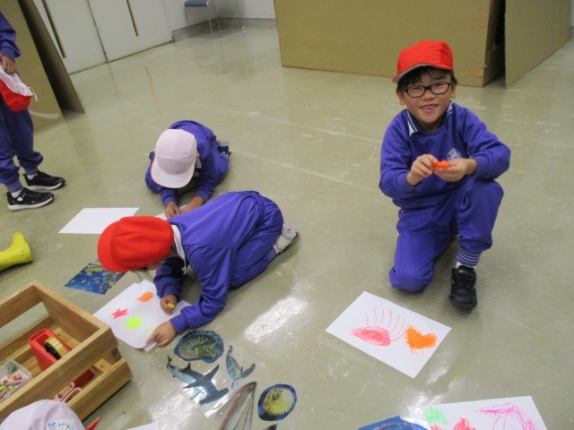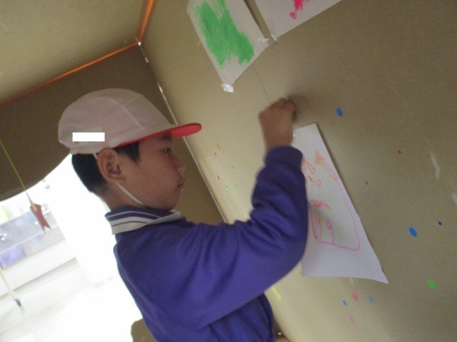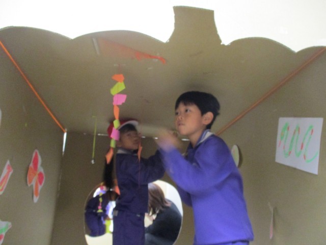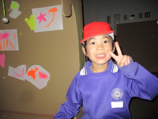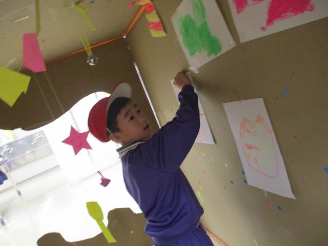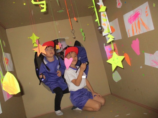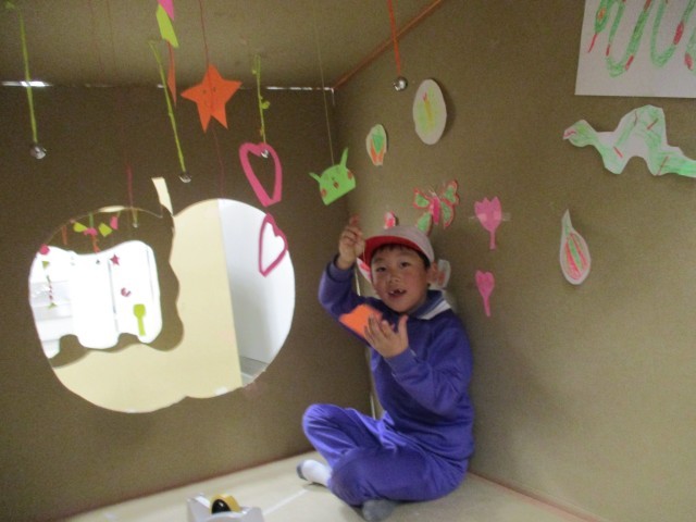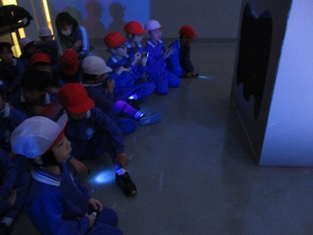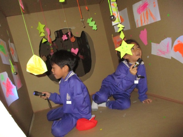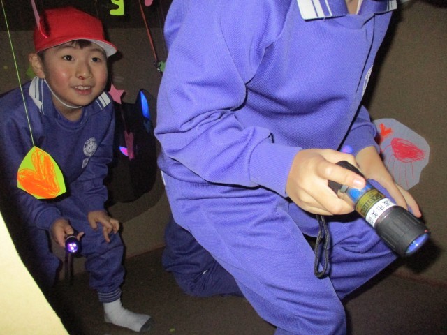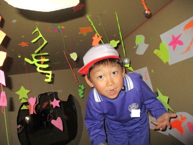 「絵が光っていてきれいだね」「あっ!僕の描いた絵だ」等と楽しそうに探検していました。