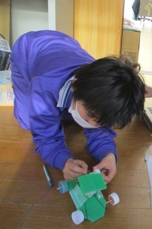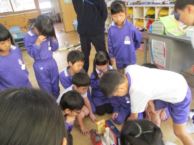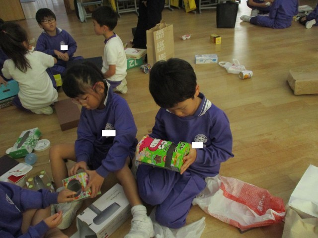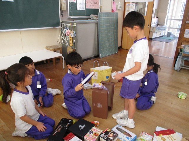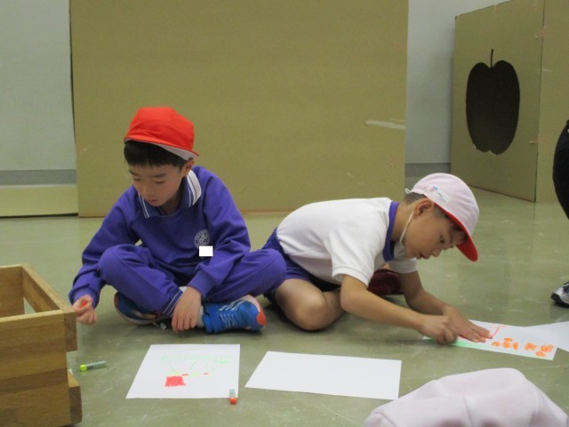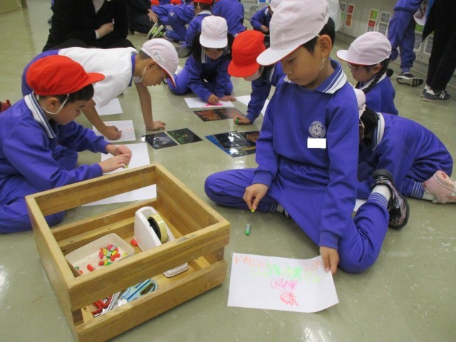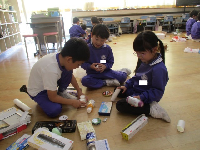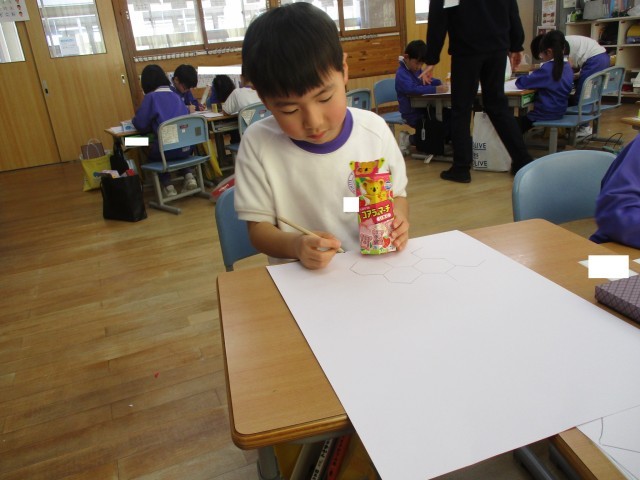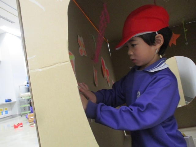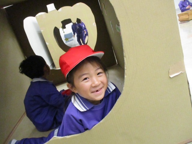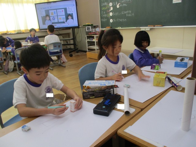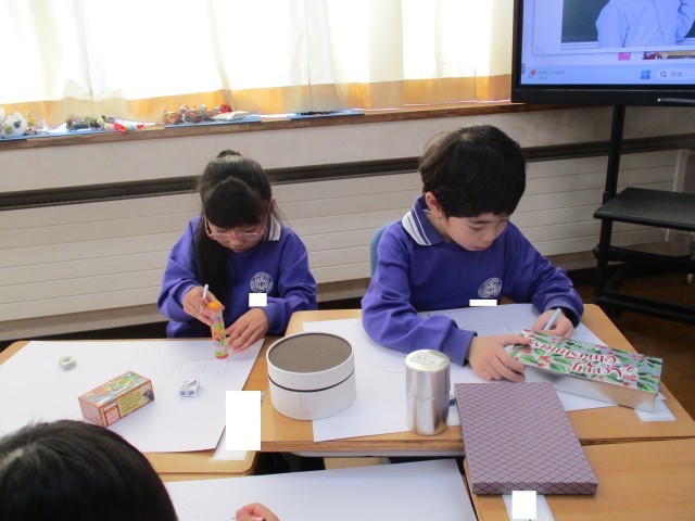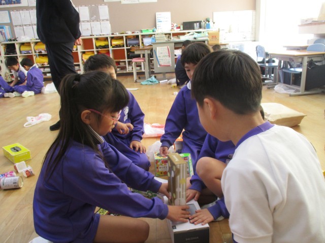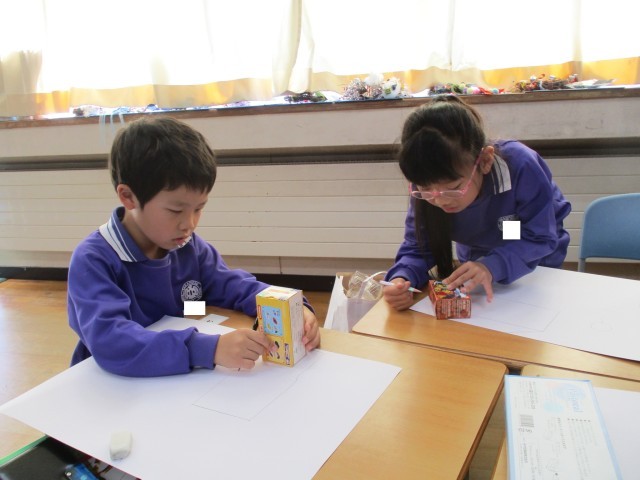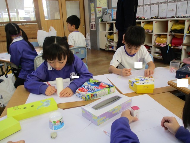 自分の描きたいものに合った形の箱を選んだり、同じ箱でも向きを変えると大きさや形が変わることに気付いたりしました。