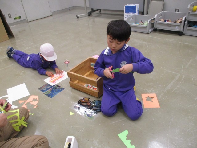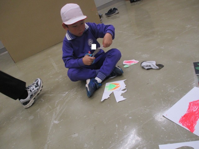 蛍光クレパスで紙に絵を描いたり、蛍光ペーパーを好きな形に切り取ったりしました。