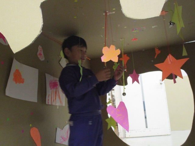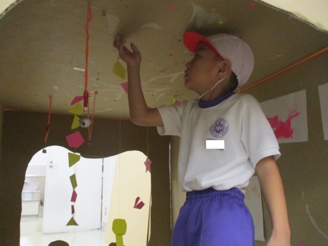 描いたものや切り取ったものを段ボールの洞窟に貼り付けました。