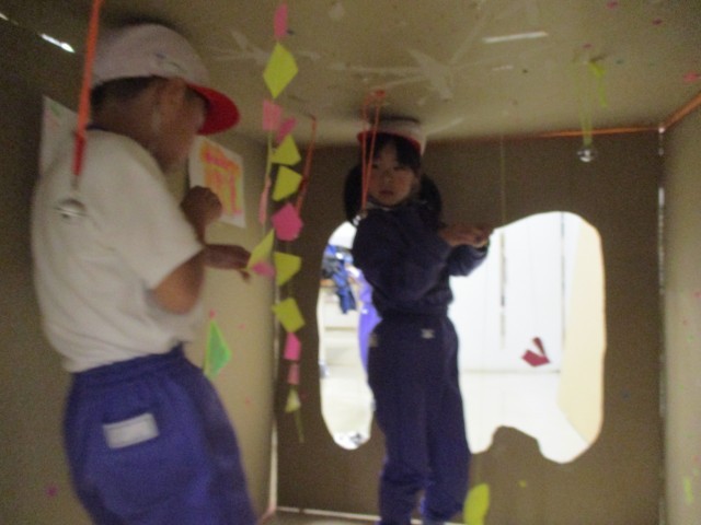 各グループの洞窟が出来上がったら、全てをつなげて部屋を真っ暗にしました。