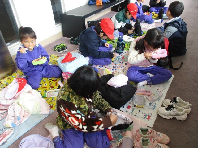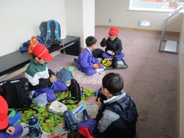 チューリップ公園に移動してお弁当を食べていると…雨が降ってきてしまったので、美術館の3階でお弁当タイムの続きをしました。