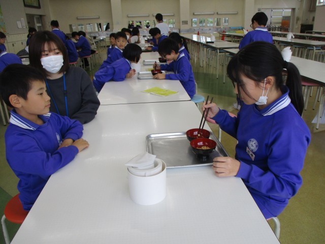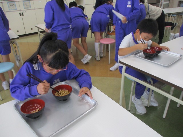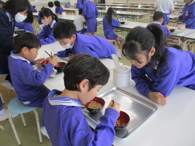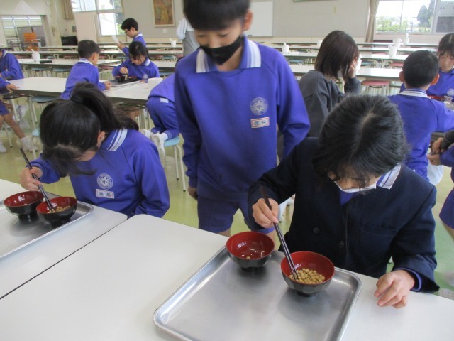 給食委員会が企画した豆つまみ大会が行われました。これは、みんなに正しいはしの持ち方を意識してもらうためです。今日は、1・5年生の日でした。下級生には、つるつる滑ってなかなかつまめない子供がいました。中には、たくさんつまめることができる上級生がいて、周りの子供たちも驚いていました。みんなが正しいはしの持ち方で給食を食べることができるとうれしいですね。
