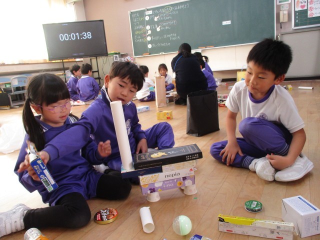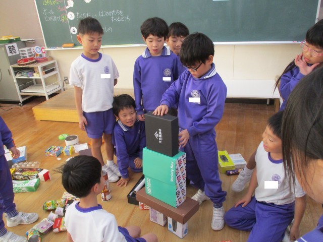 「ボールの形が1番下にあると転がってしまうよ」「大きな四角い箱を1番下にすると高いタワーが作れるよ」等、作るものによって組み合わせ方を工夫していました。