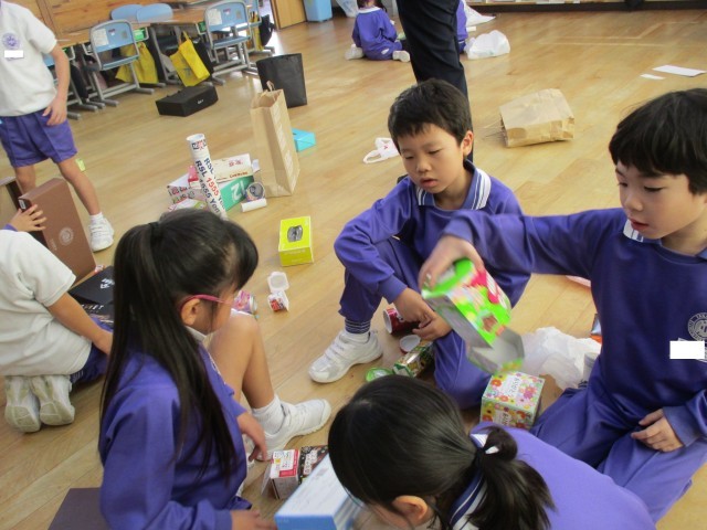 家から持って来たいろいろな形の箱を組み合わせて、タワーやキリンや電車等を作りました。