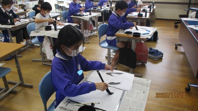 4年生では、今年度初めての書初練習をしました。今年の文字は「美しい空」です。筆を立てて書く、書き順に気を付けることを意識しながら、書道半紙に丁寧に字を書くことができました。