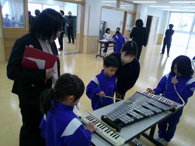 教室での学習の様子に加え、図工室や音楽室といった特別教室で学習する様子も見ていただきました。音楽科で「きらきらぼし」の練習をしていた1年生は、来校された地域の方々に聞いてもらうことができ、得意げな様子でした。