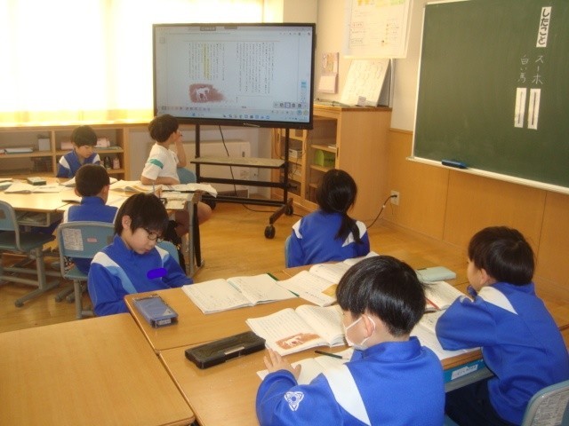 それぞれの紹介したい動物の赤ちゃんを決め、本から大切な情報を見付けながら、タブレットを使って作成しました。