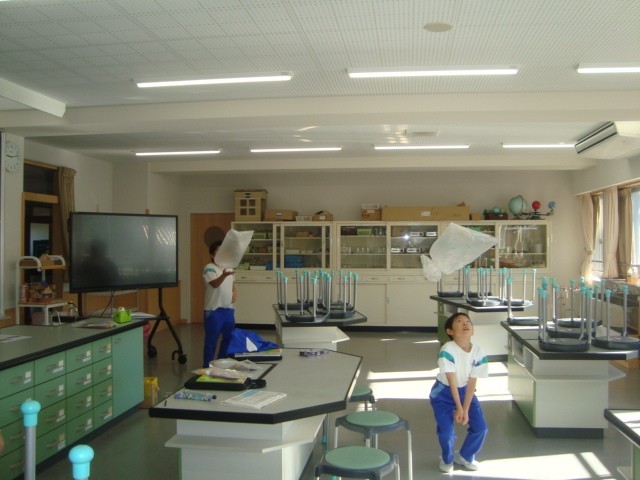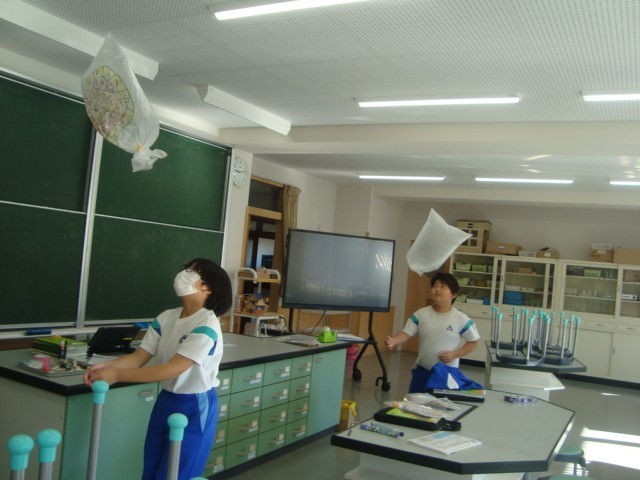 空気の学習の最終日で、テスト後に空気を集めて的当てをしたり、風船のようにとばしたりして、空気と親しみました。