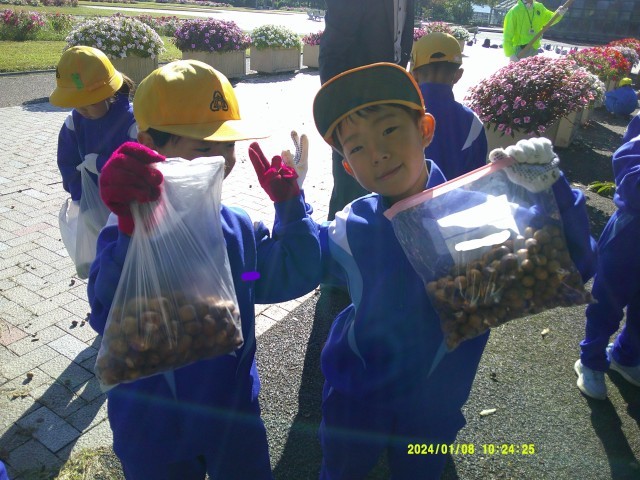 子供たちは、たくさんの種類のドングリを袋一杯に拾い、とても嬉しそうでした。