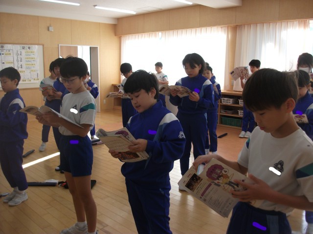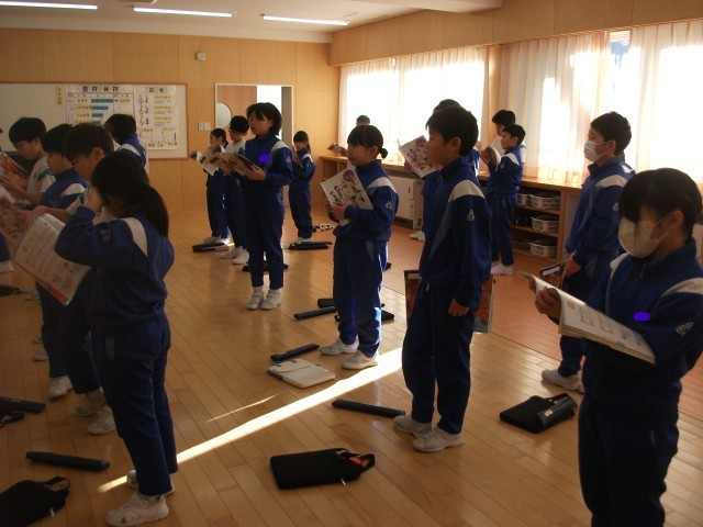 音のバランスや息の入れ方を考えながら、「オーラリー」の二部合奏を行っています。互いに音を聴き合って、音が重なり合う美しさを感じながら演奏しました。また、「オーラリー」の学習を生かし、旋律の重なり方を感じ取って「もみじ」を歌いました。