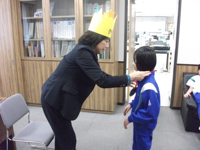 2学期に、友達や家の人、担任の先生に九九を合格して「九九名人」となった子供たちは、3学期より「九九マスター」を目指して頑張っています。校長室にいらっしゃる「かけ算大王」にすらすらと九九を唱え、出題された九九に素早く答えることができると、「九九マスター」と認められ、メダルをもらうことができます。全員合格できるようがんばります。