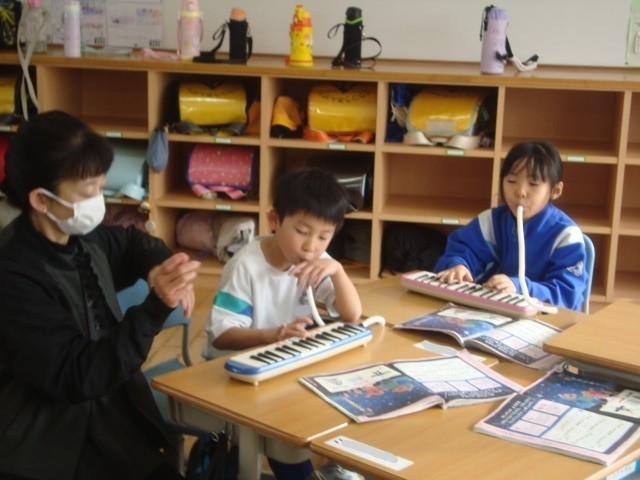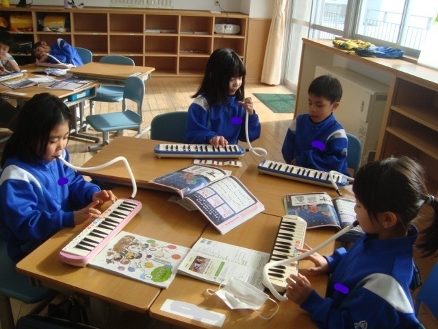 きらきらぼしを鍵盤ハーモニカで演奏することができるよう、練習をがんばっている1年生です。