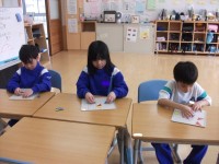 生活単元学習では、やまぶき・すずらんで行う「進級パーティー」で楽しむ風船バレーについて、やまぶき1組が企画することになっています。そこで、目当てやルール、チーム分けについてのお知らせをかきました。また国語では、1年生が、習った漢字をプリントで確認しました。入学後の1年で、ひらがな・カタカナの学習から始まって、80字もの漢字を覚えました。しっかりと一年のまとめをして、進級準備を進めていきたいと思います。