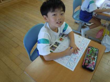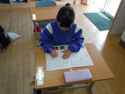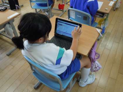 カタカナの正しい使い方を考えながら正しい形で書いています。姿勢がよいときれいな字が書けます。終わればタブレット型端末を使ってドリル学習を自分のペースで進めます。