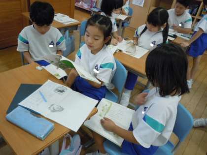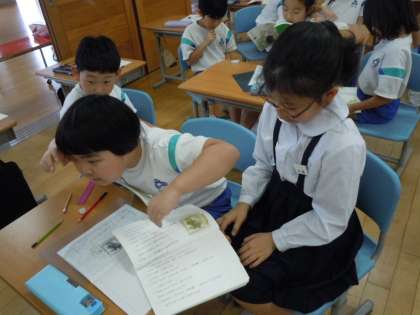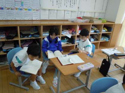 「お手紙」に出てくる「がまくん」「かえるくん」の気持ちを考えた後、3人組になって役割を決めて音読をしました。気持ちを考えた後なので、自然に身振り手振りが入って体が動きます。