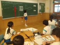 いよいよ毛筆の学習の始まりです。最初に、用具の名前や準備の仕方を練習しました。そして、筆の持ち方に気を付けていろいろな線を書きました。毛筆は線の太さが自由自在なことや、やわらかい毛でできていることが分かり、硬筆とは違った書き心地に驚いていました。