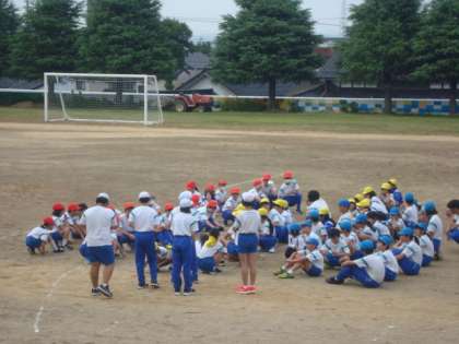 運動委員会主催の「2・4・6年生三色おにごっこ」をジャンボタイム(昼休み)に行いました。ルールマンが登場してルールを説明しました。