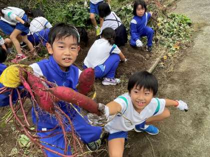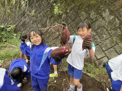 2年生の子供たちは、5月に植えたサツマイモを収穫しました。たくさんの大きなサツマイモを自分たちの手で収穫し、とても喜んでいました。また、いくつものサツマイモがつながって実っていることなど、新たな発見もあったようです。サツマイモを食べるのが楽しみです。