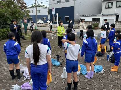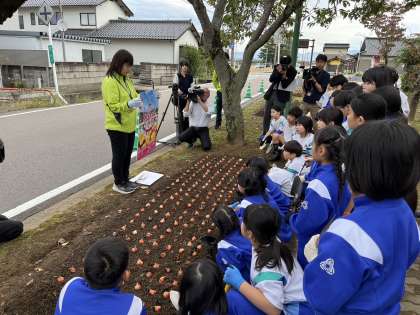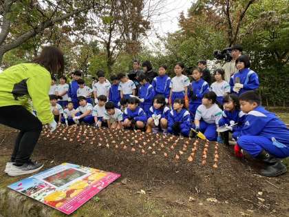 チューリップ公園周辺の花壇での、チューリップ球根植え込み体験の様子です。