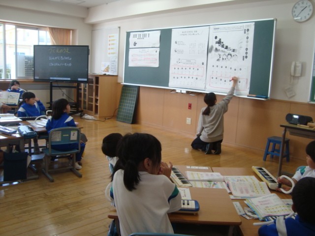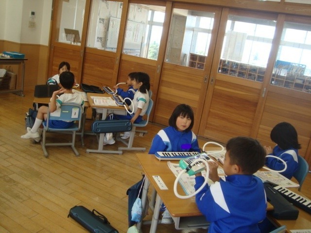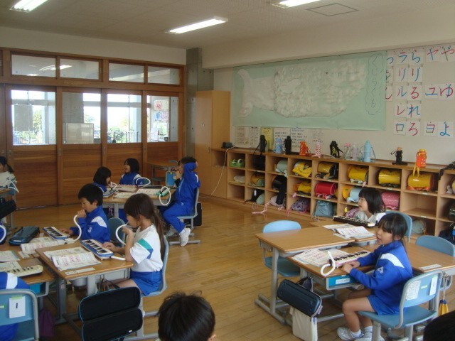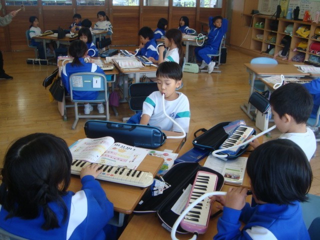 鍵盤ハーモニカでの演奏をがんばっています。「なかよし」と「ひのまる」という曲を学習しました。