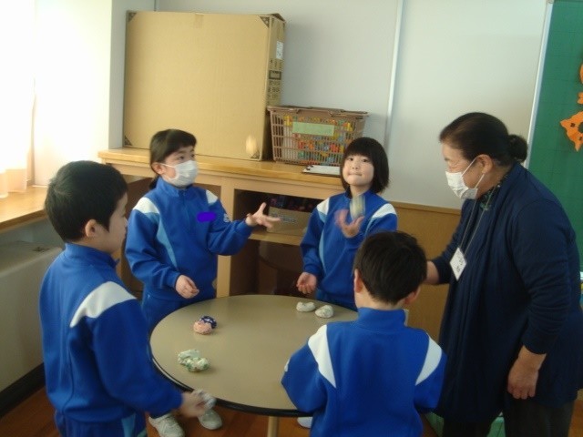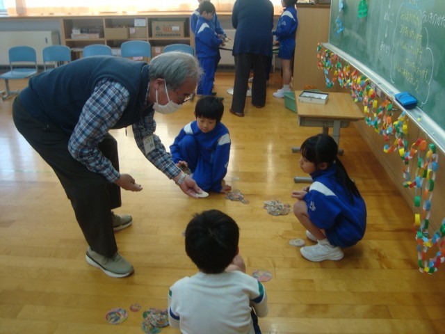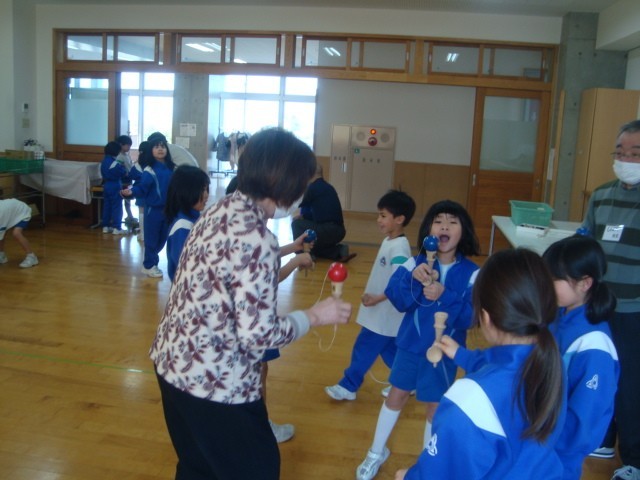 地域から6人の先生方に来ていただき、お手玉やけん玉、あやとり、メンコ、こま回しを教えてもらいました。