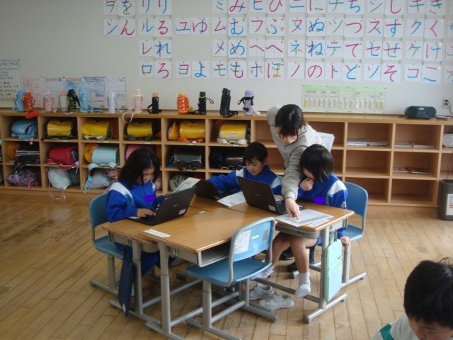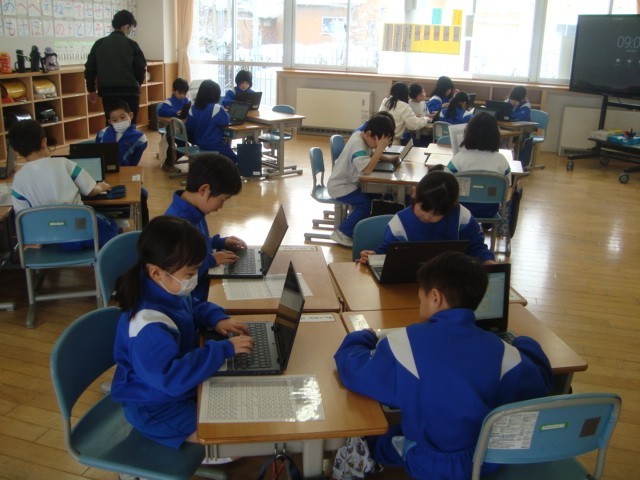 ICTの先生に工夫した教材をつくっていただき、1年生がローマ字入力に挑戦しました。