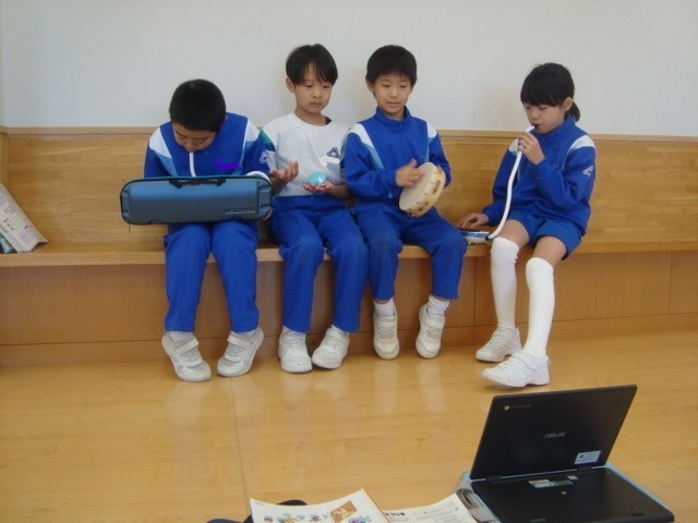 「山のポルカ」のグループ合奏をタブレットで撮影しているところです。