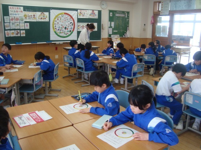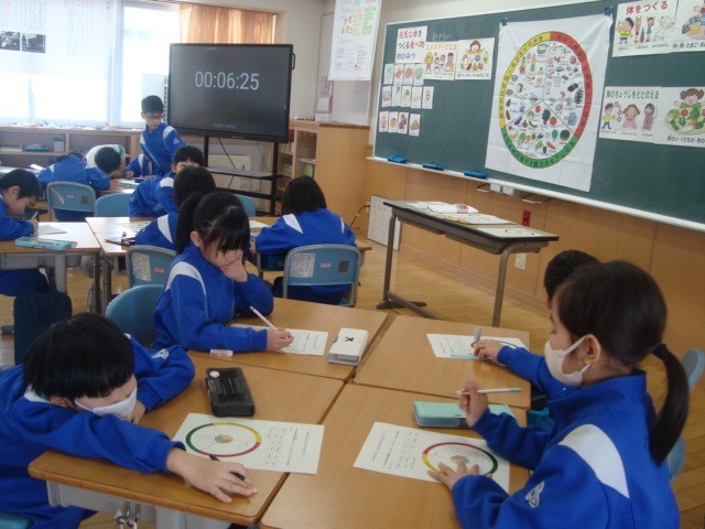 給食センターから栄養教諭さんを招いて、「元気な体をつくる食べ物のひみつ」について学習しました。