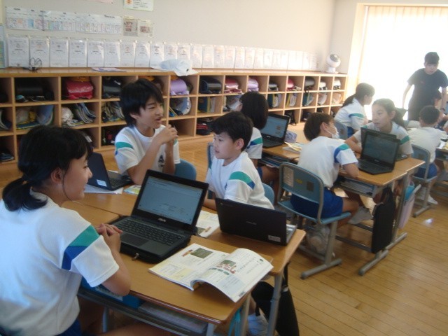 考えを書いたノートを互いに見せ合いながら、説明をし合う子供たちでした。