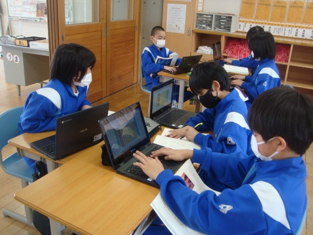 放送局で働く人が「情報をどのようにまとめ、放送しているのか調べよう」という課題から、動画を見たり、教科書を見たり、友達と関わったりしながら解決しようとしています。