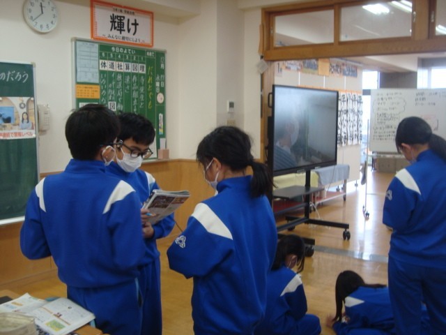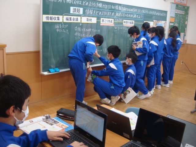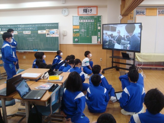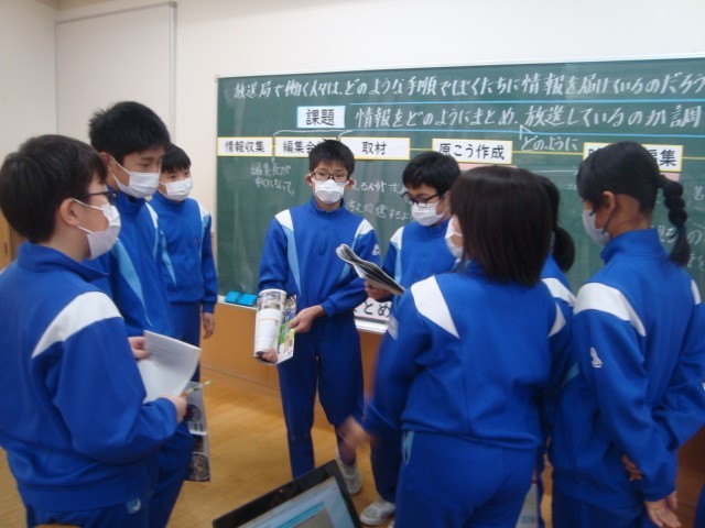 放送局で働く人が「情報をどのようにまとめ、放送しているのか調べよう」という課題から、動画を見たり、教科書を見たり、友達と関わったりしながら解決しようとしています。