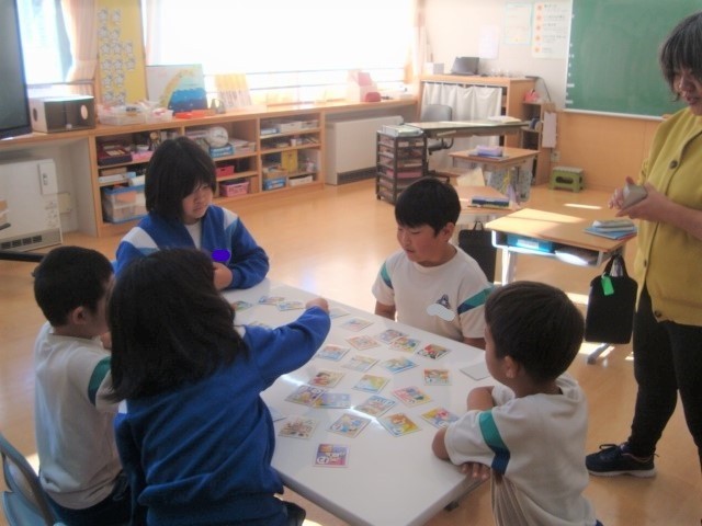 やまぶき学級1組では、犬棒かるたとりをしました。上の学年は、取った札を自分でもう一度言います。